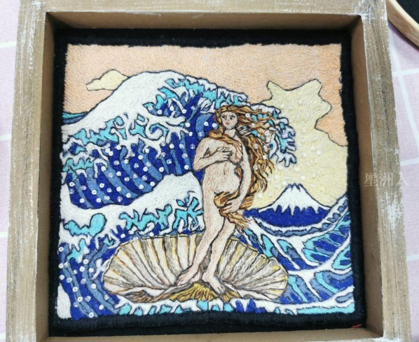 “我就喜欢乱乱琇,使用不同的针法和不同颜色的线,像画画版绣上不同颜色图案;过程中,可以疗愈心情。”