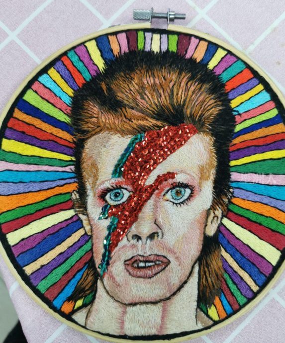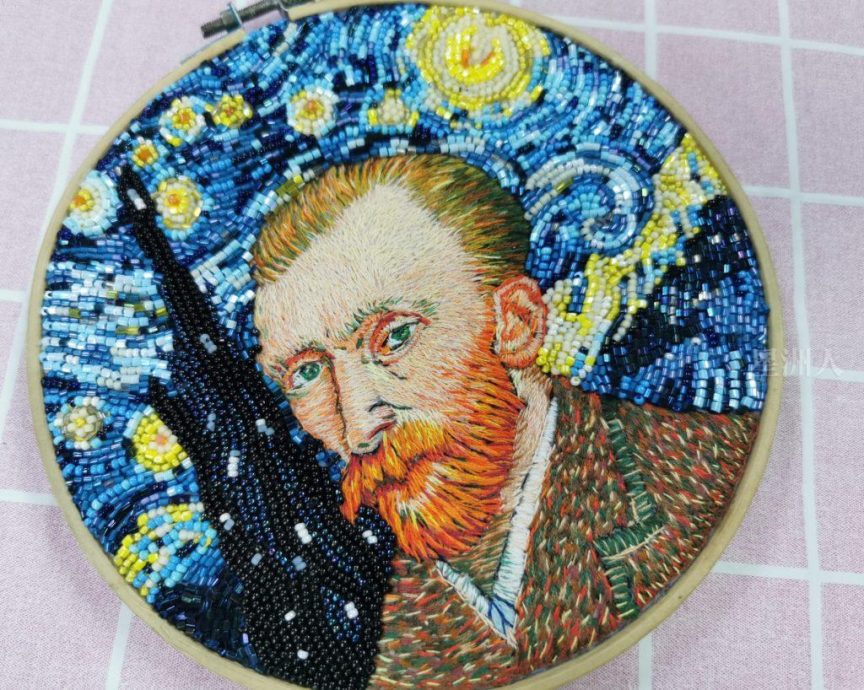 “举例说,大卫鲍伊脸上的闪电,我会用亮片来制作;在《戴珍珠耳环的少女》中的背景加入牡丹花,个人觉得是中西合拼的一种方式。至于文森特·梵高的作品中,背景就加入其他的素材,作为星光闪耀的星空。”