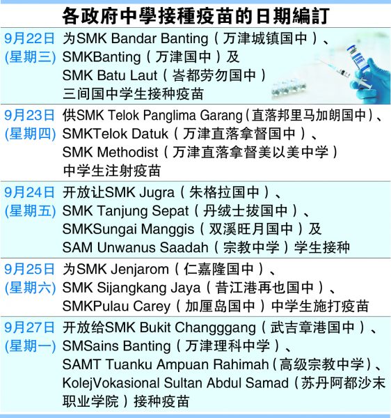 瓜冷卫生局已经安排区内各中学中四和中五学生,由本月22日(星期三)起分批到位于万津瓜冷市议会隔邻的体育馆疫苗接种中心施打疫苗。开放时间从早上8时30分至中午12时30分,以及下午2时30分至下午4时。