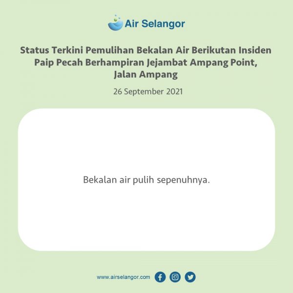 Kesemua kawasan di Wilayah Gombak yang terjejas dengan gangguan bekalan air tidak berjadual berikutan kerja-kerja pembaikan paip pecah berhampiran Jejambat Ampang Point, Jalan Ampang telah pulih sepenuhnya pada jam 8:00 malam, 26 September 2021.#AirSelangor pic.twitter.com/16lSObnXqE