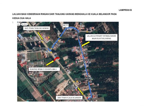 轻型车辆可取道柏马当路衔接杨桃岭路(Jln Bkt Belimbing)北上至甘榜巴西班让(Kg Pasir Panjang),根据工程局使用谷歌地图规划的这条替代路线,驾驶者将多出3分钟或1.7公里路。