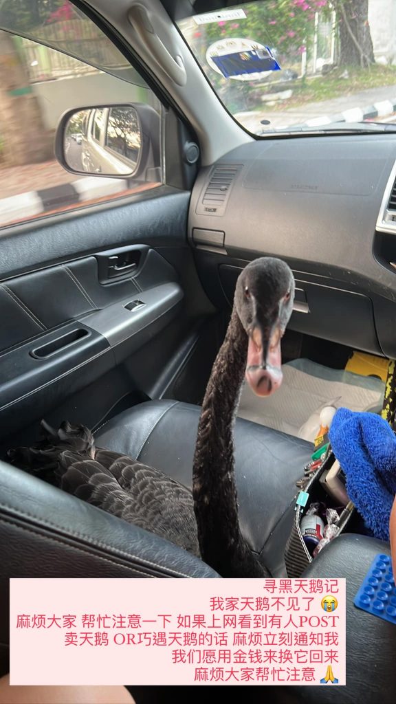 女网友在脸书群组贴文,要求网民帮忙留意走失的“黑天鹅”。(取自脸书)