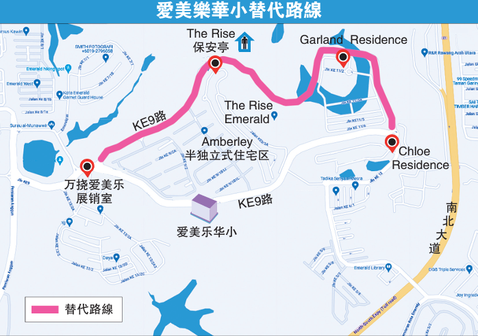 上述替代路线主要在The Rise住宅区后方及新发展区之间辟出新路,将KE12路(Chloe Residence)交通圈与KE9路衔接起来,居民今后可绕开爱美乐华小前方路段,使用途经Garland Residence住宅区和The Rise Emerald住宅区的新路出入。
