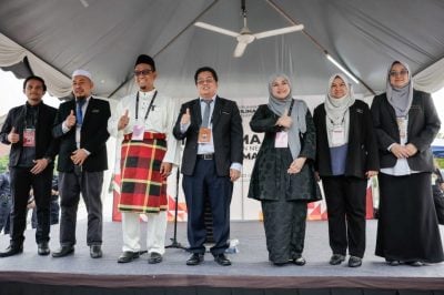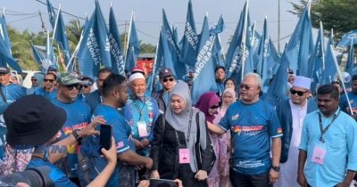 首次上战场的努鲁今早在诺奥马的陪同下,与上百名的支持者步行至丹绒加弄园丘管理机构提名中心。