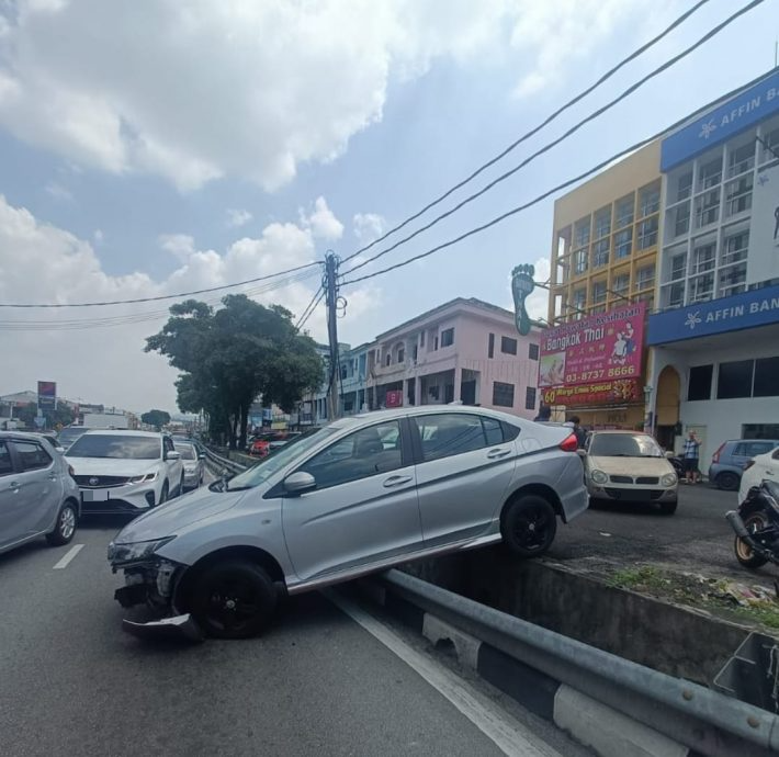 (加影5日讯)逾60岁男车主准备停车时,误将P档入D档,导致轿车直撞沟渠栏杆卡着,幸没有撞入车龙,惟也吓坏一些路过的车主。