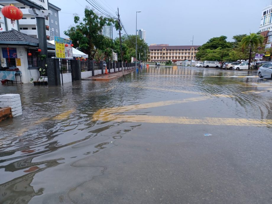 他指出,由于该校外面的沟渠狭小,当湍急的水流无法及时排出后,以致水流倒溢涌出马路和校园。