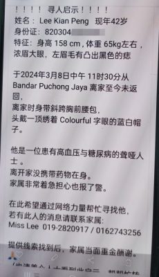 公众如有李健平的消息,可联系其本人(019-282 0917)或016-274 3256,家人应诺提供茶资酬谢。