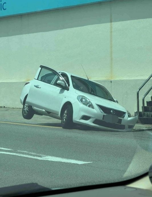 (八打灵再也1日讯)马路上的沟渠盖形同虚设,车子驶过时整个沟渠盖塌陷,导致车轮陷入了水沟里动弹不得,须劳动众人帮忙抬起车子。