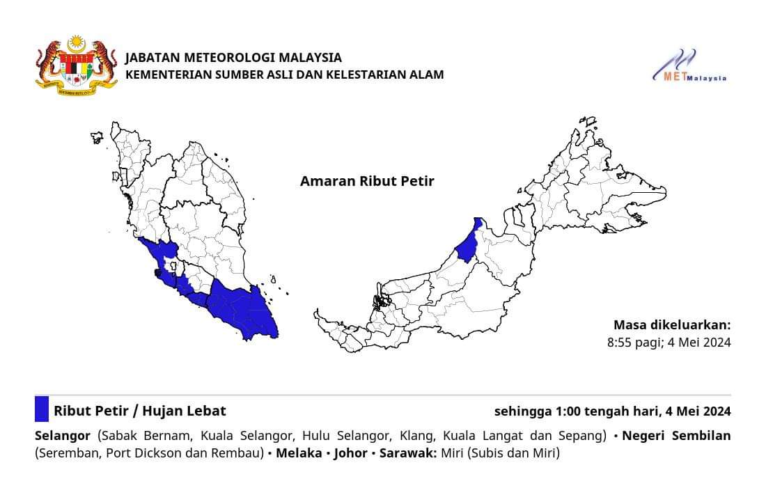 另外,大马气象局也在脸书提醒,雪州多个地区包括沙白安南、瓜拉雪兰莪、巴生、瓜拉冷岳及雪邦今早截至下午1时都可能下豪雨、雷雨或刮大风,雨量可能超过每小时20毫米。