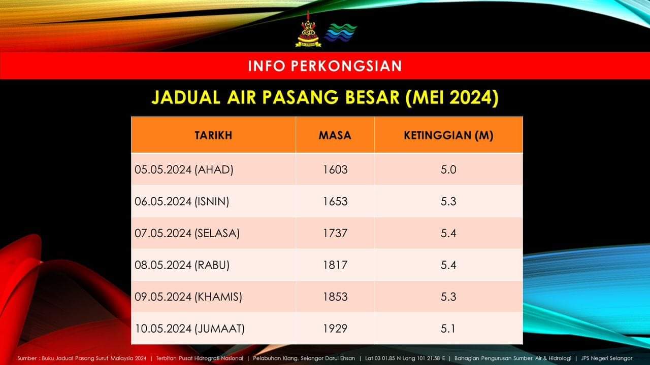 据水利灌溉局在脸书上的公告显示,雪州滨海从本月5日起至10日将迎来新一波大涨潮,海潮高度介于5公尺至5.4公尺;其中7日(周二)和8日(周三)下午5时至傍晚6时的海潮最高。