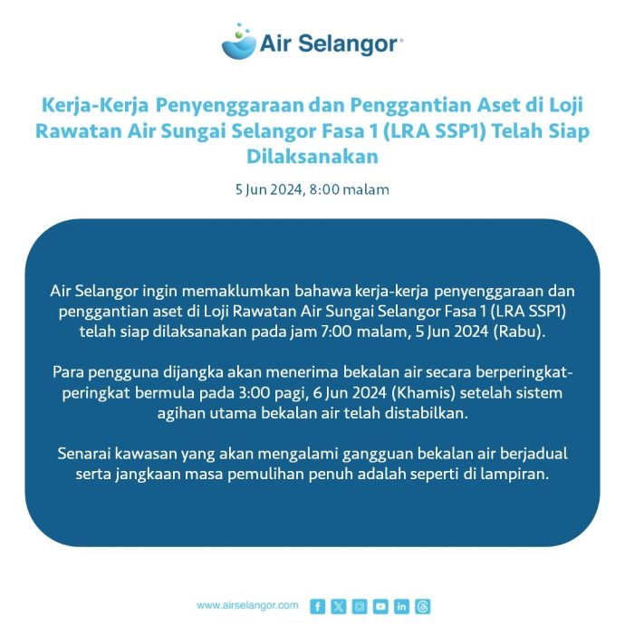 另外,根据脸书贴文指出,用户可以通过https://waterupdates.airselangor.com/获取更多制水时间表的最新消息,或者是通过“Air Selangor”手机应用程式、官方脸书、Instagram dan X获取消息。