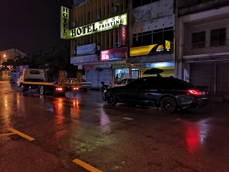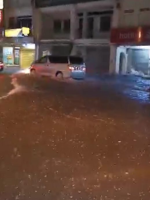 (万挠7日讯)雨神降临,在短短15分钟内便已将万挠后街(Jalan Maxwell)淹成汪洋水路!