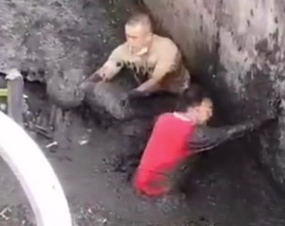 据视频画面显示,妇女跌入沟渠后,整个人已陷入泥堆中;两名男子奋力将她从泥堆内拖拉出来。