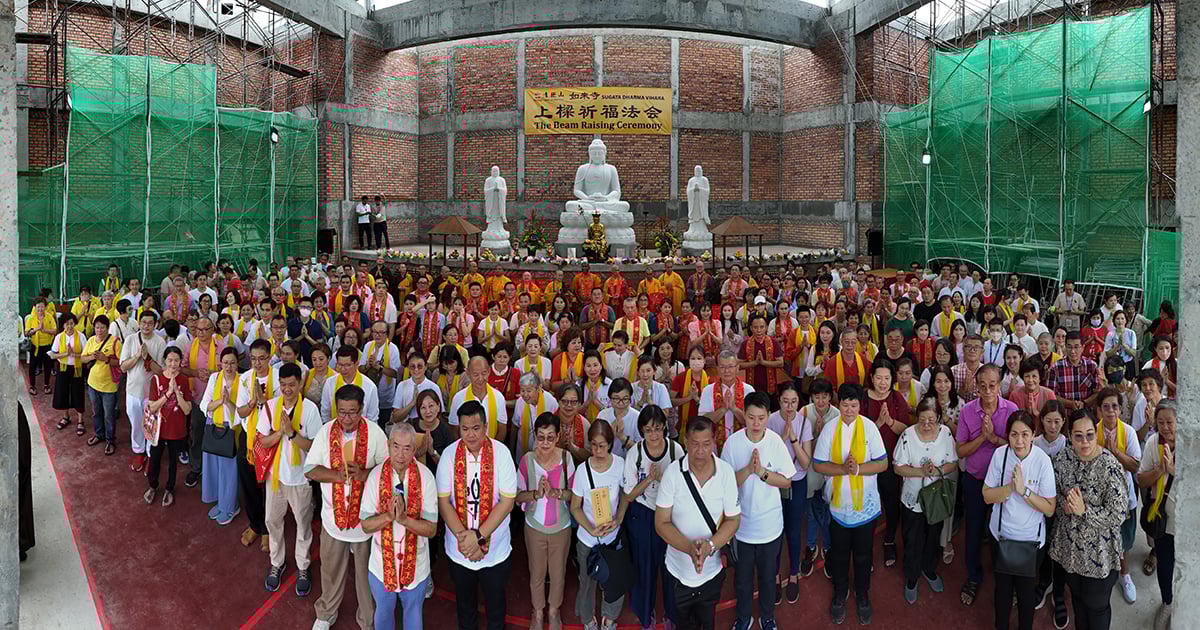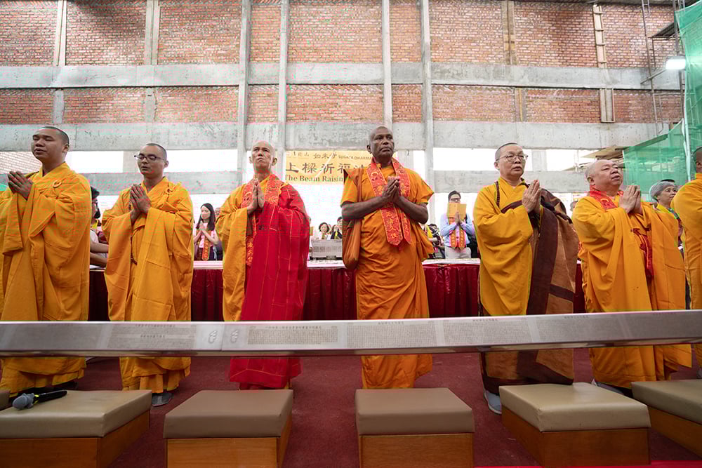上樑祈福法会融合南北传的诵经仪式,南传佛教首座拉南加拉长老带领大众诵经,还有慈观长老、法炬山僧团与诸位法师带领大众一起诵经、祈福、洒净,大众一起诚念炉香赞及大悲咒,法师围绕主体建筑洒净,以期未来成为当地人的心灵皈依处,让佛教扎根,绽放光芒。