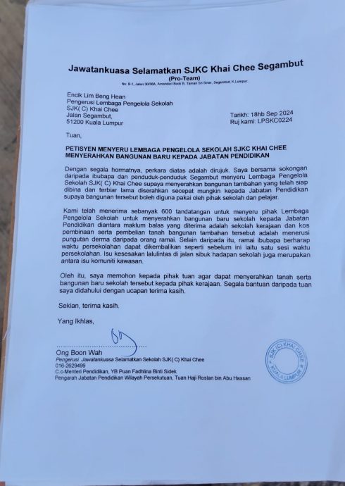 目前请愿书签名运动收集约600人签名,催促启智华小董事部移交新校舍土地拥有权给教育部,透明化交代所有筹募建大楼捐款去向。