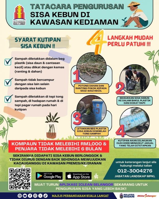 (瓜冷5日讯)瓜拉冷岳市议会促请居民配合及遵照管理园艺垃圾的标准作业程序(SOP),确保各自住宅或建筑物场所范围内的园艺垃圾(Sisa Kebun)包括树枝、树干及树叶等获得妥善处理和清除。