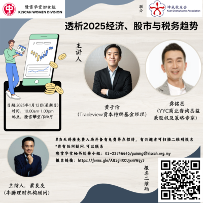 讲座将邀请2位资深专家,即黄子伦和龚铭恩主讲,前者将在讲座中深入剖析2025年全球及马来西亚的经济形势,股市投资的最新趋势,并分享如何在经济不确定性中寻找投资机会;后者则将分享2025年税务政策的变化与趋势,特别是如何利用税务优化策略来为企业和个人减轻税负,同时讲解如何在企业管理中实施有效的财税策略。