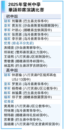 (巴生19日讯)来自巴生光华华中的刘馨璘及梳邦再也USJ 13国中的锺恩瑜分别夺得“2025年雪州中学华语即席演讲比赛”初中组及高中组冠军。