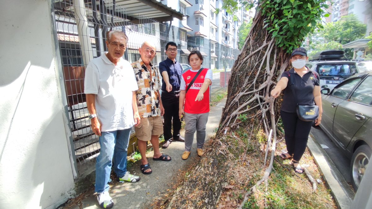《大都会》社区报记者在古仔马朱12路KEP组屋居民及士布爹国会选区居民代表委员会主席蓝诗琳的带领下,到现场巡视老树根系过于发达所造成的问题。