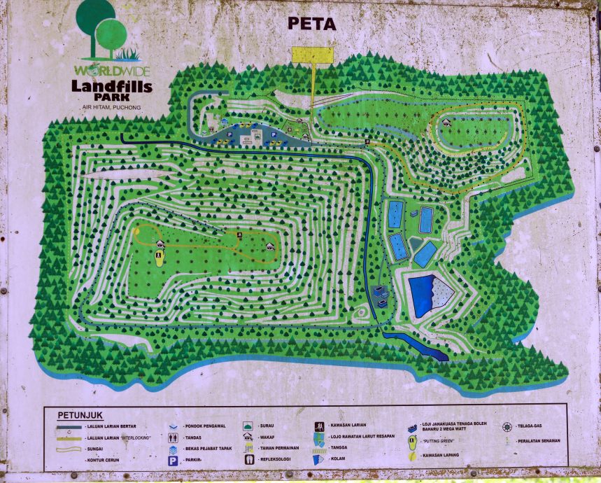 公园的最高点是昔日的垃圾土埋场,设有多个气井设施,作为排放地底下垃圾的气体,因此仍会闻到阵阵臭味。被处理的垃圾在地下进行腐烂,产生甲烷气体,再转化为再生能源。