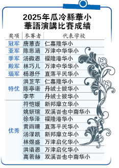 (丹绒士拔9日讯)2025年瓜拉冷岳县华小华语演讲暨笔试比赛日前在丹绒士拔华小礼堂圆满举行,获得瓜冷县的8所华小各派2名学生参加演讲比赛,以及各4名学生参加笔试比赛。