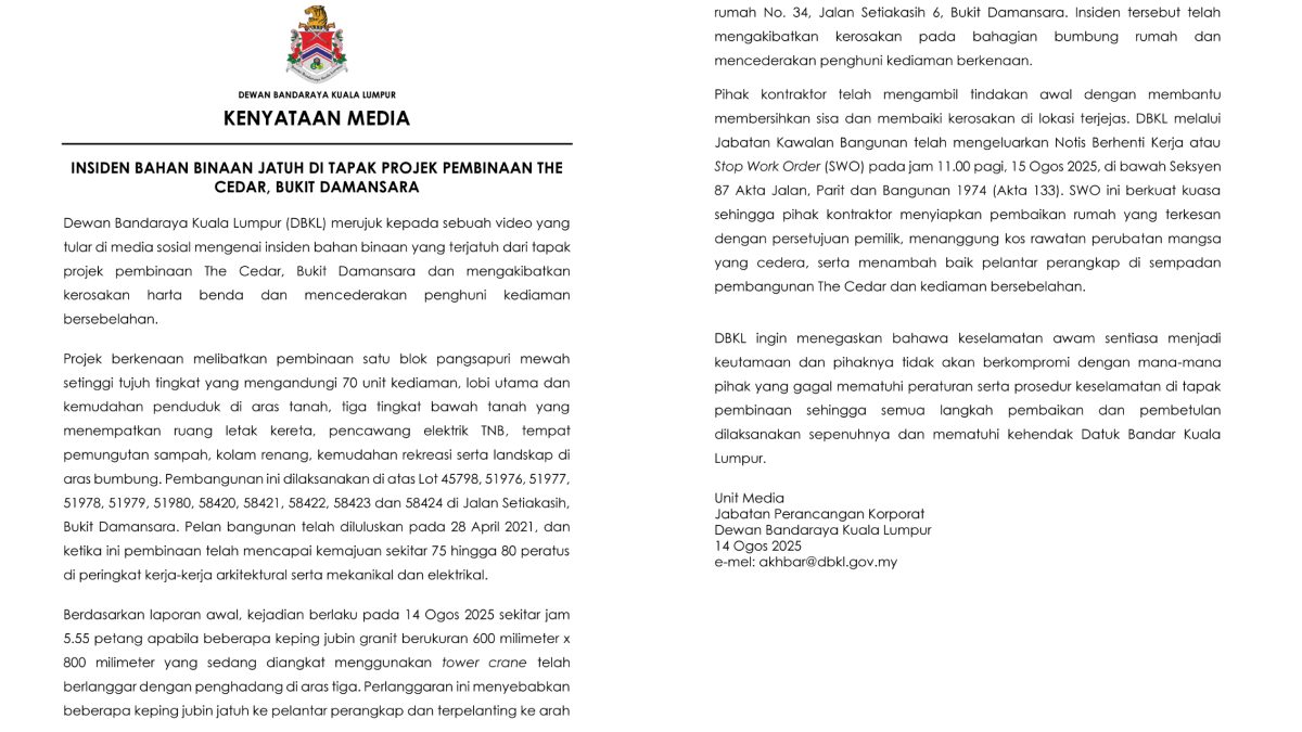 文告强调,人民的公共安全始终是市政局的首要任务,绝不容忍任何未遵守建筑工地安全规定的行为。所有修复与改正措施须全面落实,并符合吉隆坡市长的要求,方可复工。