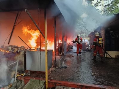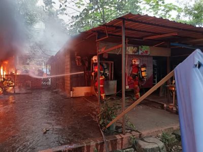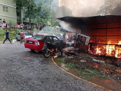 (八打灵再也19日讯)火烧熟食摊档,5间并排的摊档被大火烧成废墟,并殃及2辆轿车3辆摩托车,所幸没有造成人命伤亡!