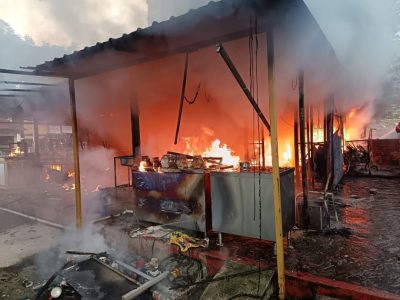 他说,大火共吞噬5间熟食摊档,总面积共50呎乘50呎,1辆宝腾赛佳及威拉轿车,分别蒙受20%及60%的烧毁,另外3辆摩托车各蒙受50%的烧毁。