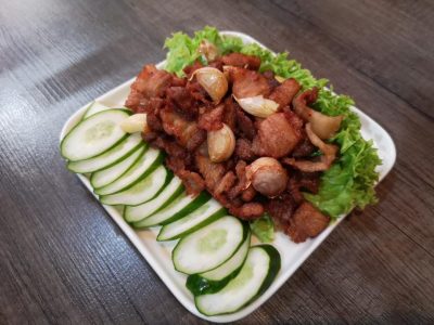 5. 油锅下油烧至摄氏160度左右(放入竹筷冒出小气泡状),将花肉片一片、一片放入油中炸每面各两分钟后;蒜头也一并加入炸约2分钟,即可捞出盛盘。盘内可放入黄瓜、生菜点缀。
