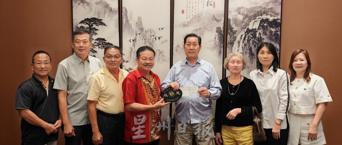 林宽源(右四起)移交10万令吉支票给王睦端。左起为谢声发、周源河、王木财;右起是潘雪莹、林丽珍及陈玉兰。(陈秋成摄)