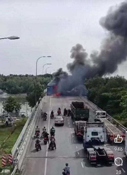 根据脸书社群Bomba Channel专页发布的两则短视频,可见到火魔肆虐的景象非常可怕。桥上3条车道全被阻断,许多摩托车骑士、罗里和轿车司机只能被迫停下,“观看”这一幕,等待火灭安全后才能继续通行,引发长达好几公里的大塞车。