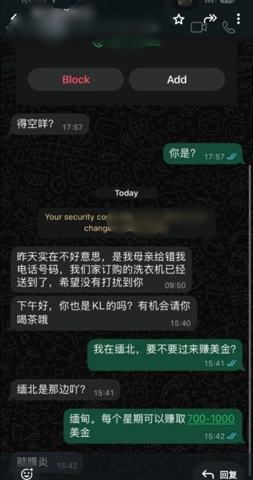 老千通过WhatsApp留言说,母亲给错电话号码,他们家订购洗衣机已送到,然后问陈狄源是否在吉隆坡,想邀约喝茶,只是这种假身份开场白脚本太令人熟悉,陈狄源将计就计表示人在缅北,问老千要不要过去赚美金时,老千还反问在缅北哪里。