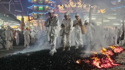 在法师进行仪式开路后,由九皇大帝圣驾过火境,善信抬着神銮与一众董事部成员以及为数近600人的大批身穿白衫白裤的信众一起走过目测大概20呎长的火坑。