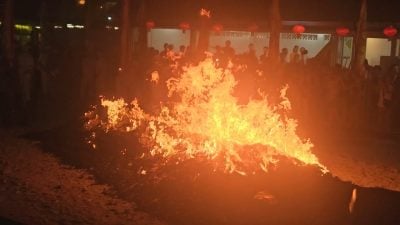仪式开始前,工作人员利用木桩、铲子不断拍打及理平善信将踩踏而过的火炭路,也不断浇油以维持路旁两侧的火势不灭。