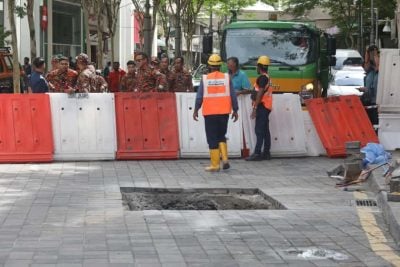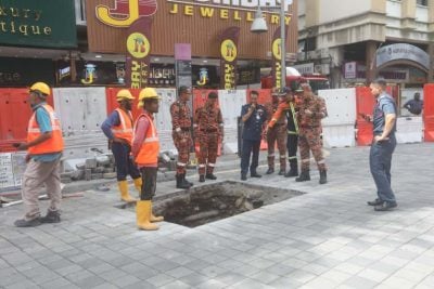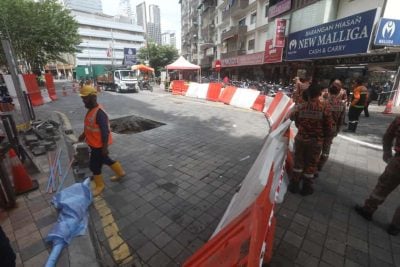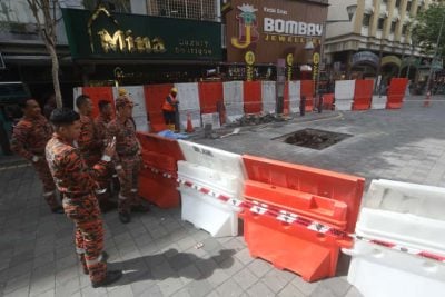 (八打灵再也10日讯)吉隆坡市中心印度清真寺一带再发生路陷事件,受影响路段目前暂时封闭,车辆禁止通行!