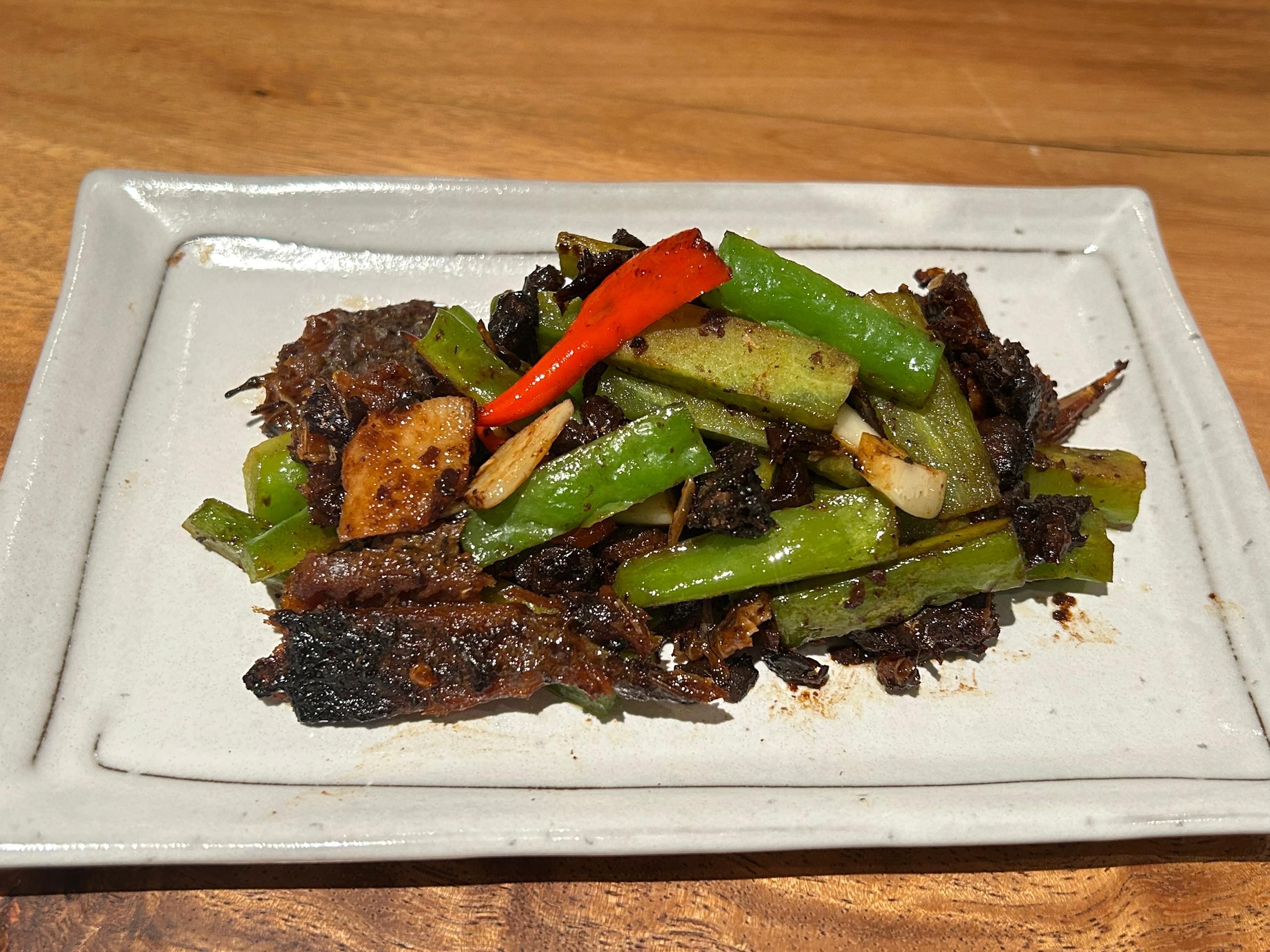 | 5. 放入汆汤好的苦瓜、小辣椒和所有调味料大火翻炒。 |