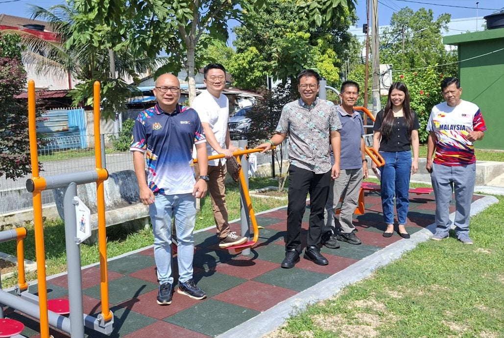 王俊伟今早与乌冷县新村发展官何纹安及仙水港新村管委会主席方添桦视察已完成的户外健身运动器材,出席者包括士毛月社区中心协调员丘钦瀚、锡米山新村管委会主席李洁盈及村委李福祥。