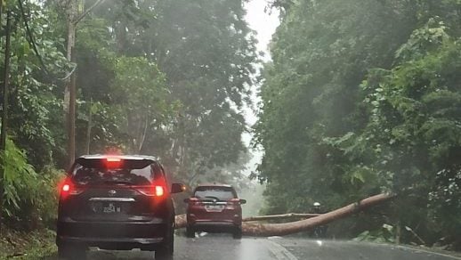 继两天前的狂风暴雨吹倒大树,压中行驶中的轿车,导致年仅20岁的巫裔司机在峇冬加里通往云顶高原的途中当场被砸死后,今午再有至少两地有参天大树被吹得连根而起,横躺在马路上。