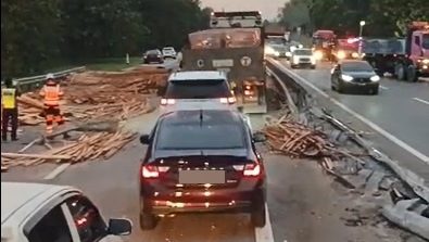 一辆运送木材的罗里疑为了闪避前方罗里,失控撞毁分界堤,冲入反方向的草坡处。一车的木材洒落一地,引发南北大道古来南下路段严重交通阻塞。
