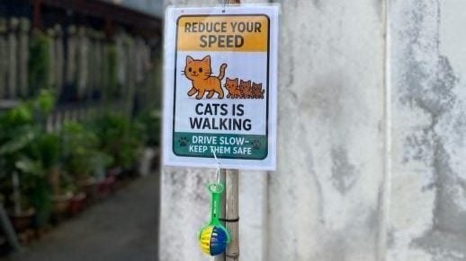 为了保护社区内的猫咪,避免它们被超速的车子撞到,一名女子特意在住宅区的电灯柱竖起一块“请减速慢行”的牌子,提醒众人减慢车速,注意路上经过的猫咪。