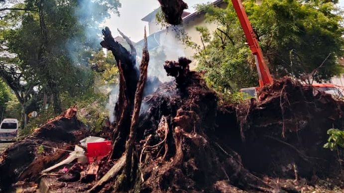 路旁百年老树根部疑似阴燃(smouldering fire),火势在内部烧了整整约10个小时后,最后整棵大树轰然倒下,所幸无人伤亡,也未造成任何财物损失