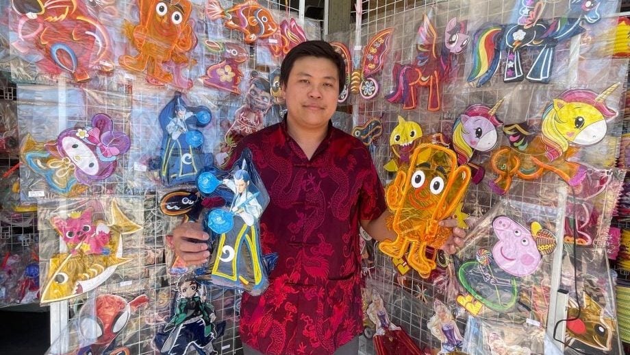 中秋节将至,市面上的灯笼百花齐放,一名年轻父亲以双手编织心意,用铁线、玻璃纸和浆糊制作出一盏盏充满童趣与色彩缤纷的手工灯笼。