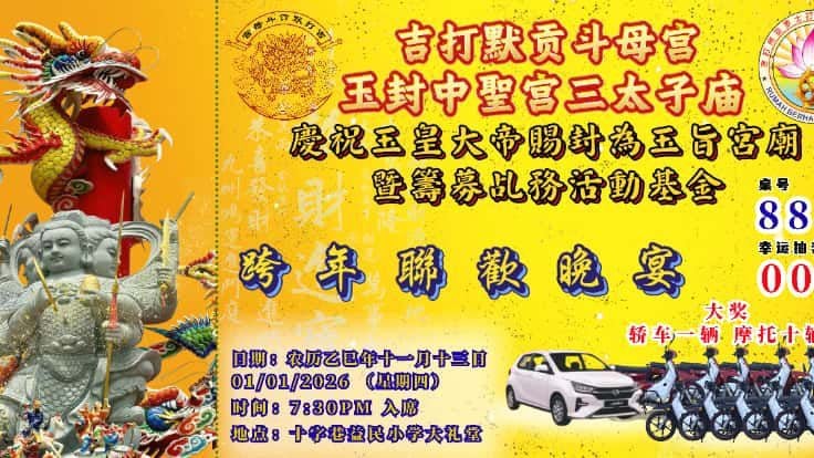 (亚罗士打29日讯)为欢庆玉皇大帝赐封为“玉旨宫庙”,默贡斗母宫将于明年1月1日(周四)晚7时30分,在吉北区十字港益民小学大礼堂举办千人联欢晚宴。 晚宴有一辆第二国产车Axia以及10辆摩托等作为幸运抽奖奖品,欢迎各界善信踊跃参与。 该宫今日发文告指出,这场宴会旨在为宫庙乩务活动基金筹款,即日起开始售卖餐券。 每张餐券为200令吉,每桌10个席位共2000令吉。欲购票者可联系谢文川(017-473 8636)或Allen Goh(011-533 91818)。