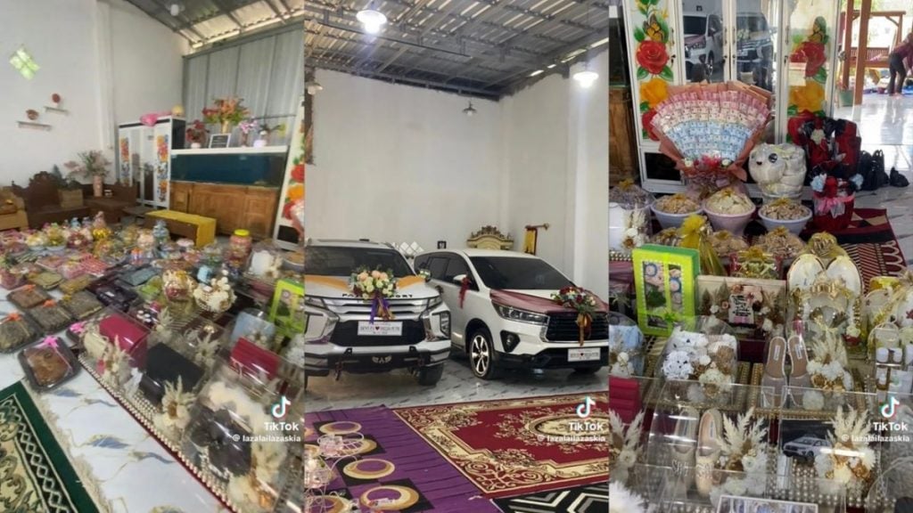 印尼中爪哇地区一名新郎大手笔奉上汽车、珠宝和名牌包,让新娘成为全场焦点,让人羡慕!