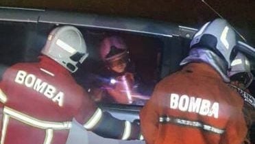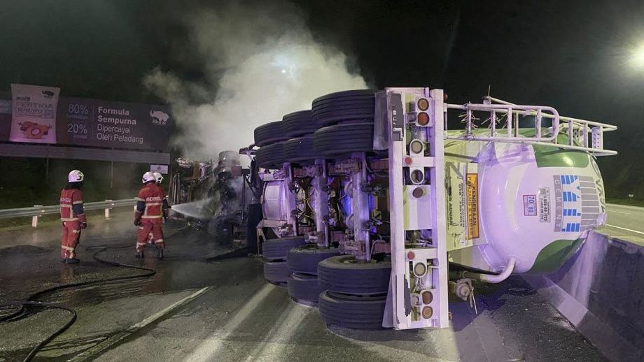 洋灰罗里翻覆横卧加叻大道后起火 司机逃生不及成焦尸