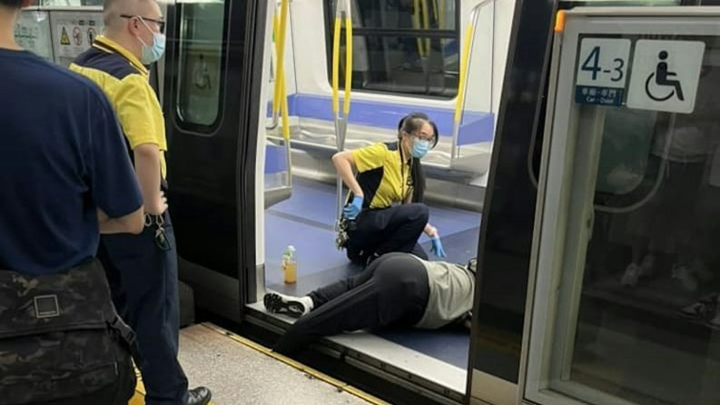 香港地铁有一名女乘客在走上车厢时,右脚竟不小心卡在月台幕门及列车之间的罅隙,整个小腿拗曲,上身及左脚则趴在车厢地上,痛得她动弹不得,整个场面让人看得触目惊心!