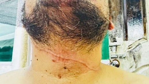 摩托车骑士遭一条横挂在马路中央的鱼线勒中颈部,当场失控摔车,导致身体多处擦伤及胸口疼痛。