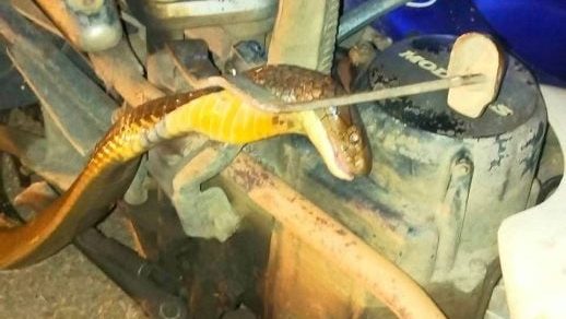 眼镜王蛇过马路,摩托车骑士发现辗过这条蛇后马上煞车,岂知蛇却卡在煞车器的脚踏杆和引擎之间。骑士吓得马上跳下摩托车。