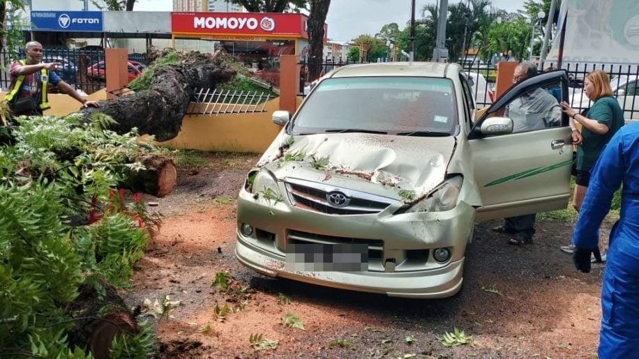 继两天前的狂风暴雨吹倒大树,压中行驶中的轿车,导致年仅20岁的巫裔司机在峇冬加里通往云顶高原的途中当场被砸死后,今午再有至少两地有参天大树被吹得连根而起,横躺在马路上。