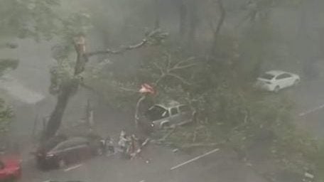 大树倒下压中轿车 司机在吃早餐逃过一劫